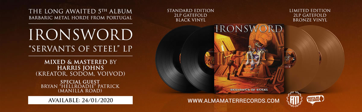 Label owner and Moonspell vocalist Ribeiro states:“Alma Mater is very proud of having IRONSWORD on their ranks! They are an amazing and sincere band which breathes Heavy Metal through all their pores. Their new album Servants of Steel will for sure take their fans by storm and it’s a sign of great times to come!”